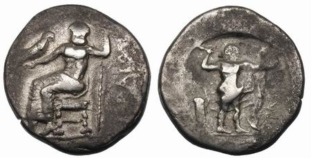 | Svoronos 21 | Crete, Praesus AR Stater. ca 330–300 BC. ΠΡAIM, Zeus Dictaeus enthroned left, head facing, holding eagle on extended right hand and resting left on sceptre / ΠΡAI, Herakles standing right, holding club in raised right hand, lionskin draped over extended left arm, bow in bowcase standing vertically behind, all in shallow circular incuse. Rider 228.
