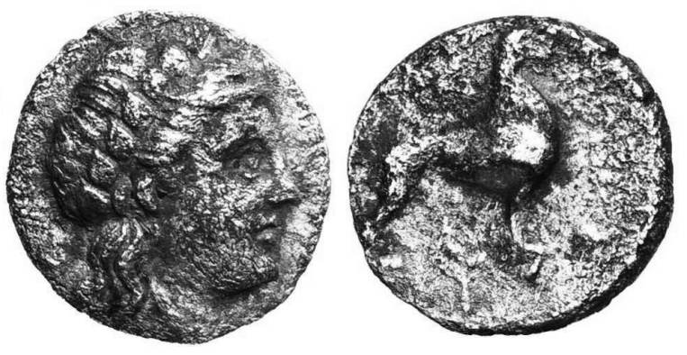 | BMC (Crete) 1 | Andros, Cyclades, AR drachm, ca, 300-200 BC. 2.82 g. Youthful head of Dionysos right, wreathed with ivy. (usually has a Φ behind the head). / (ANΔΡIΩN), panther walking right. BMC (Crete) 1; SNG Cop 600; Paschales 22; Babelon Traité II-3, 1293. | Text | Image |