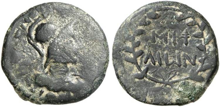 | RPC 1294 | Melos, Cyclades, AE25 (AE drachm). 1st c. AD. 7.1 g. ΔΡAXMH, helmeted draped bust of Athena right. / MH-ΛIωN in two lines within wreath. RPC 1294.6; BMC 38; SNG Cop 694 (rev legend configuration and Omega form var of Paris 270-272, with MHΛ-IΩN). | Text | Image |