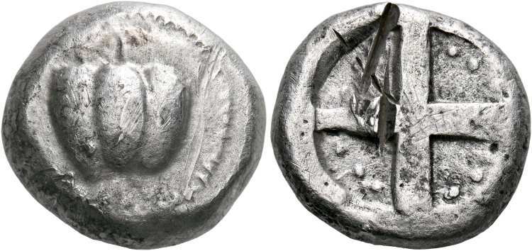 | Jameson 1280 | Melos, Cyclades. AR stater. 460-450 BC. 21 mm, 14.09 g. Pomegranate with two leaves. / Circular incuse divided into quarters by two broad lines; with three dots in each quarter. Jameson 1280; Sheedy IV, 21. | Text | Image |