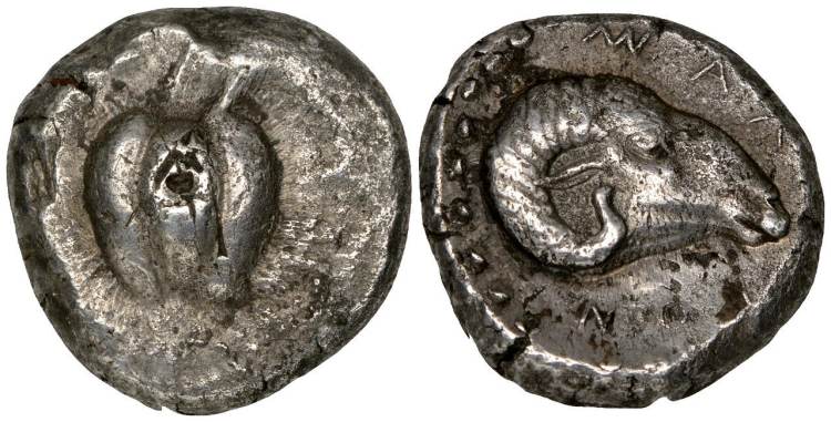 | Jameson 1296 | Melos, Cycladic Islands, AR stater, ca. 420-416 BC. 14.12 g. Pomegranate. / MAΛION, ram's head right. Jameson Coll. 1296 (this coin); Jameson Trouvaille 21 (ditto); Traité II-3, 1378 (ditto); Kraay-Hirmer 531. | Text | Image |