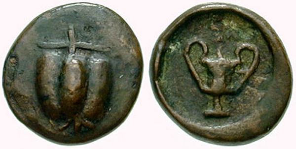 | Mionnet II 46 | Cyclades, Melos. Ca 3rd Century BC. AE 12mm, 3.39 g. Pomegranate / M-A, kantharos in circular incuse. BMC 14-15. | Text | Image |