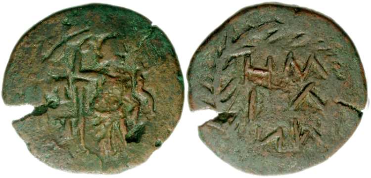 | RPC 1300 | Melos, Cyclades, AE19, Pseudo-autonomous issue. Time of Nero, 54-68 AD. 3.98 g. Ti. Pankleos, magistrate. MHΛIΩN, helmeted bust of Athena right, pomegranate behind head/ EΠI TI ΠANKΛEOC TO Γ, legend in four lines within wreath. RPC 1300; SNG Cop 696; BMC 44; Mionnet II, 54. | Text | Image |