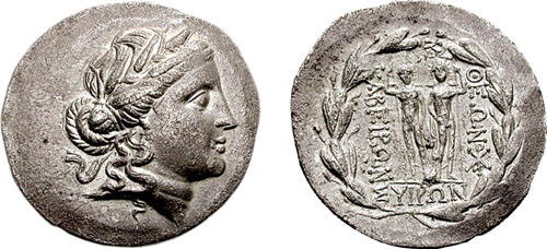 | Dewing 1968 | Cyclades, Syros. Circa 150 BC. AR Tetradrachm. Wreathed head of Demeter right / The two Kabiri (or Dioskuri) standing facing, each holding sceptre & surmounted by star; monogram to right, all within wreath. Winterthur 2319. | Text | Image |