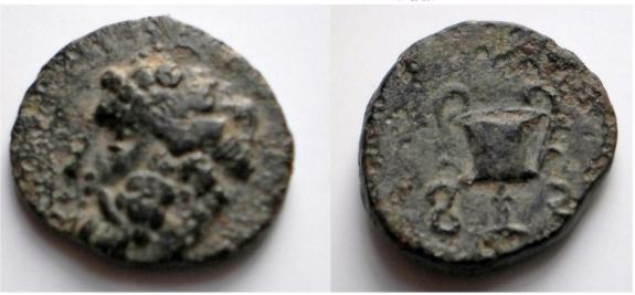 | BMC 24 | Antoninus Pius, AE21 of Syros, Cyclades. AD 138-161. 7.82 g. AYT KAI CEB ANTωNEINOC, laureate head right. / CYΡI KABIΡΩN, the Kabiri personified by the head of Faustina II right, facing the head of Marcus Aurelius left, corn ear between them, bee and star below. BMC 24; RPC online 4707; SNG Cop 762; Paris 431; Mionnet Supp. IV, 292-293. | Text | Image |