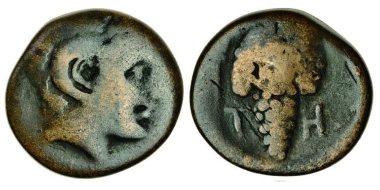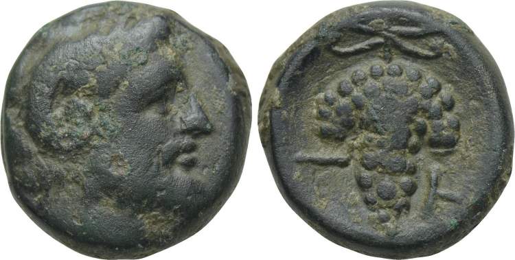 | Mionnet Supp. IV, 318 | Tenos, Cyclades, AE18. ca 288-250 BC. Youthful, unbearded head of Zeus Ammon right / T-H to left and right of bunch of grapes. Mionnet Supp. IV, 318. | Text | Image |