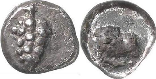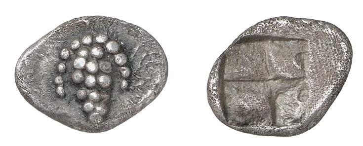 | McClean 7298 | Tenos, Cyclades, AR hemidrachm, Aegian standard. 6th c. BC. 2.36 g. Bunch of grapes / Quadripartite incuse punch of regular shape. McClean 7298; Pozzi 2057; de Luynes 2383; Weber 4731. | Text | Image |