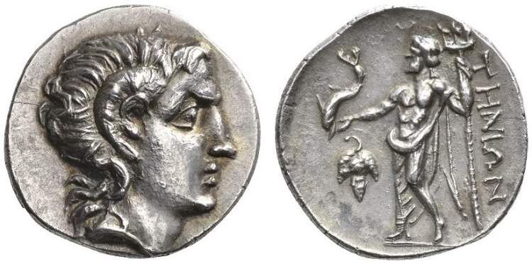 | Mionnet Supp. IV, 312 Sear SG 3158 | Tenos, Cyclades, AR didrachm, ca 250 BC. 6.88 g. Youthful, unbearded, laureate head of Zeus Ammon right / THNI, Poseidon standing left, holding dolphin and trident, bunch of grapes in left field. Mionnet Supp. IV, 312; SNG Cop 769. | Text | Image |