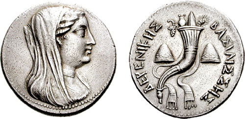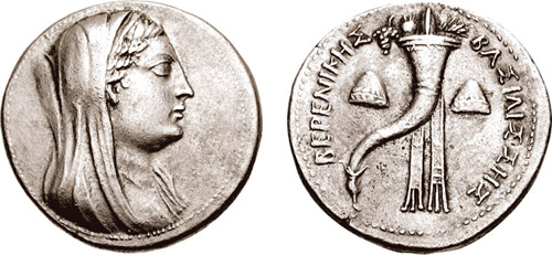 | Svoronos 988 | Ptolemaic Kingdom, Berenike II AR Pentakaidekadrachm. Alexandria mint. Struck under Ptolemy III, 246-221 BC. Diademed and veiled bust right / BEΡENIKHΣ BAΣIΛIΣΣHΣ, cornucopiae bound with fillet between two pilei. | Text | Image |