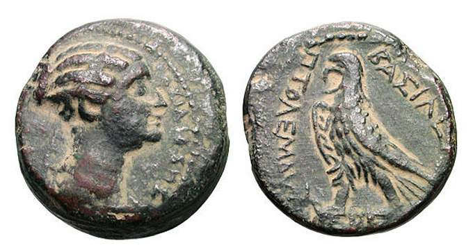 | Svoronos 1056 | Berenice II AE18, struck under Ptolemy III. 246-221 BC. 4.72 g. Ras Ibn Hani, Syria, mint. BEΡENIKHΣ BAΣIΛIΣΣHΣ, head of Berenice II right, hair in a bun / BAΣIΛEΩΣ ΠTOΛEMAIOY, eagle standing left on thunderbolt, wings spread. EY in left field. Svoronos 1056; Berlin 10201; Cox, Curium, 83; Paphos II, 57. | Text | Image |