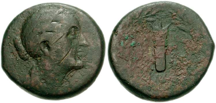| Svoronos 321 | Berenice I or II, AE hemiobol, Kyrene mint. ca 244-221 BC. 19mm, 6.08 g. No legend, diademed and draped bust right / BAΣIΛIΣΣHΣ BEΡENIKHΣ, rudder, monogram of Magas below, all within wreath. Svoronos 321 (Berenike I). | Text | Image |