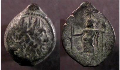 | Neopaphos AE17 | Cyprus, Cleopatra VII, 51-30BC, AE17 (hemiobol) (3.29g) Neopaphos Mint, Laureate head of Zeus to right. / No legend. Zeus standing head to right, holding ears of corn on single stalk(?) in right hand and a sceptre in the left hand; star above head. | Text | Image | Text | Image |