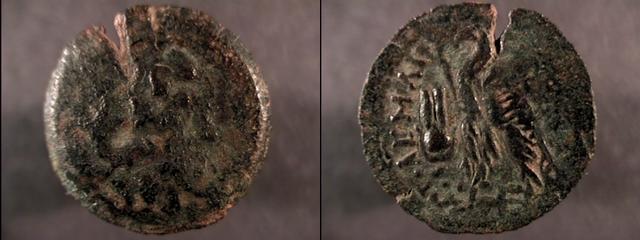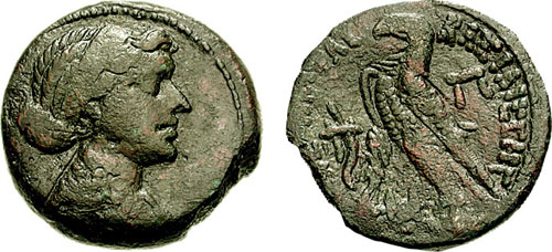 | Svoronos 1162 | Cleopatra VII Philopator AE Chalkous-Sixteenth Unit. Paphos, Cyprus mint, 51-30 BC. Diademed idealized head right / PTOLEM BASILE, Eagle standing left on thunderbolt. Svoronos 1162 (listed as Arsinoe II); cf Kreuzer, p. 45 (49). | Text | Image | |