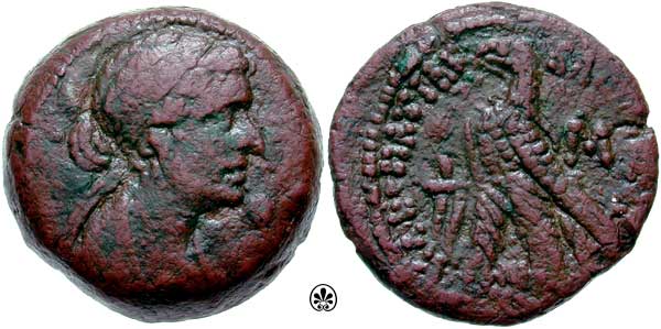 | Svoronos 1875 (2) | Cleopatra VII Thea Neotera, AE28 obol, uncertain mint of Cyprus, possibly Paphos. 9.05 g. 51-30 BC. Co-reign with Ptolemy XV (Caesarion). Bearded head of Zeus-Ammon right with ram's horn / ΠTOΛEMAIOY BAΣIΛEΩΣ, eagle with closed wings standing left on thunderbolt, palm frond behind shoulder, KYΠΡ monogram in right field. Svoronos 1875 (Cyprus, under Ptolemaeus, King of Cyprus); BMC 52; Paris 476; Mionnet VI, 334; RPC I, 3903. | Text | Image | |