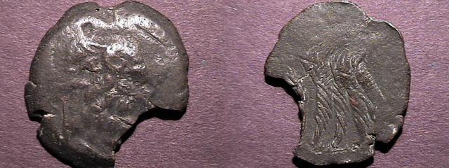 | Svoronos 1162 (2) | Cleopatra VII Philopator AE Chalkous-Sixteenth Unit. Paphos, Cyprus mint, 51-30 BC. 0.99 gr, 10.59 mm. Diademed idealized head right, sceptre over shoulder / ΠTOΛEM..BAΣIΛEΩΣ, Eagle standing left on thunderbolt. Svoronos 1162 (listed as Arsinoe II); cf. Kreuzer p. 45(49). | Text | Image | |