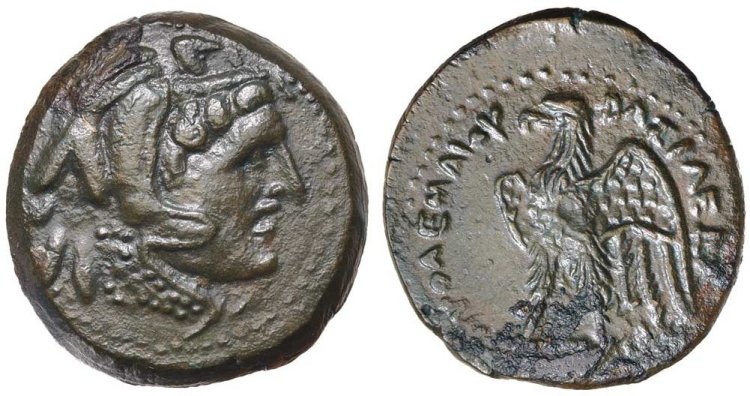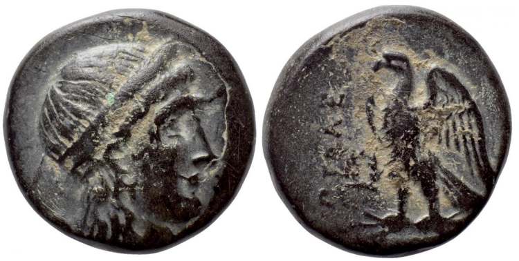 Svoronos 80 | Ptolemy I, AE15, 4 g. Cyprus mint. Bust of Aphrodite right, wearing stephane / ΠTOΛE upwards in left field, eagle standing left on thunderbolt, wings spread, wreath in left field. Svoronos 80; SNG Cop 643; BMC 59; Sear 7756. | Text | Image |