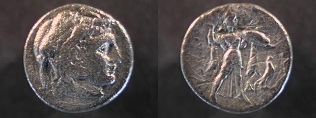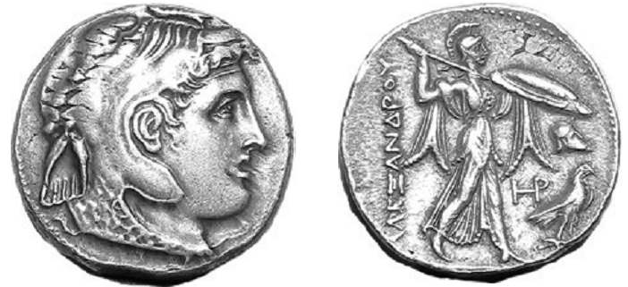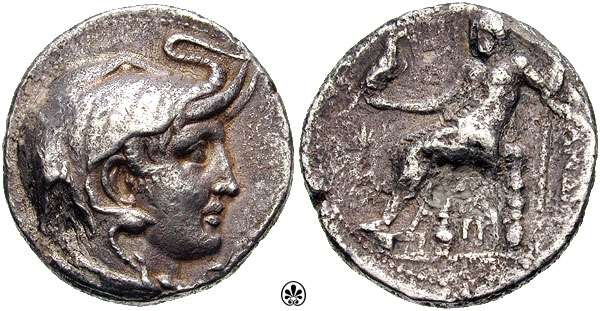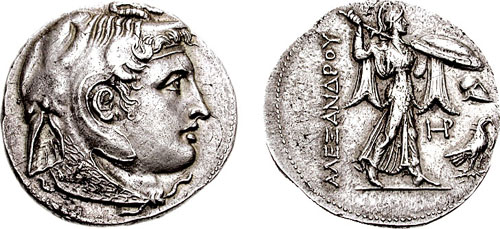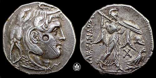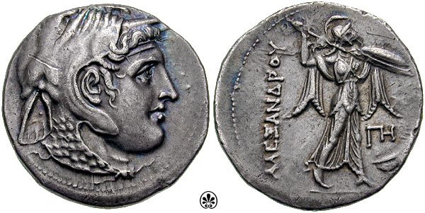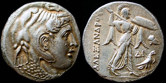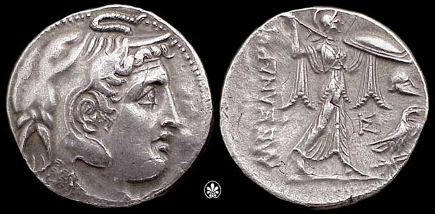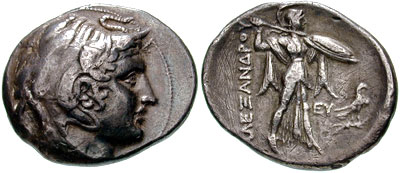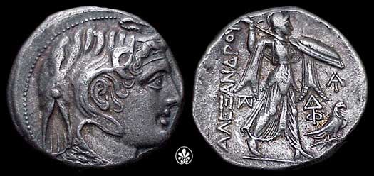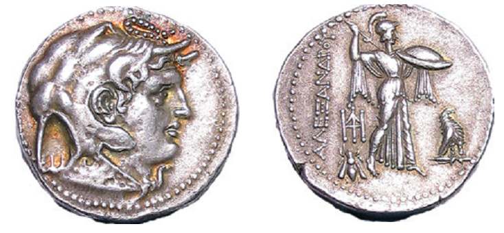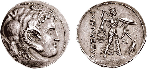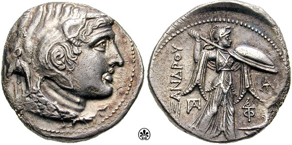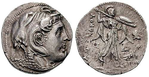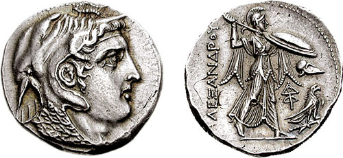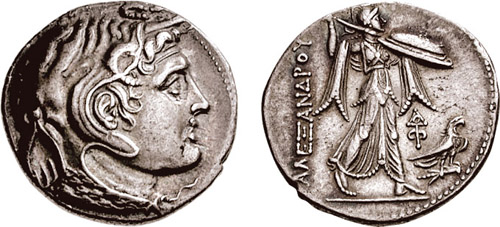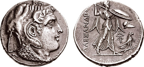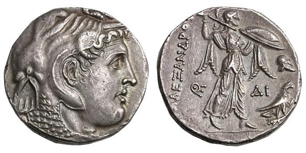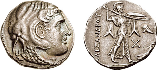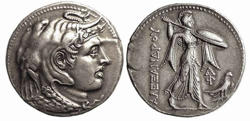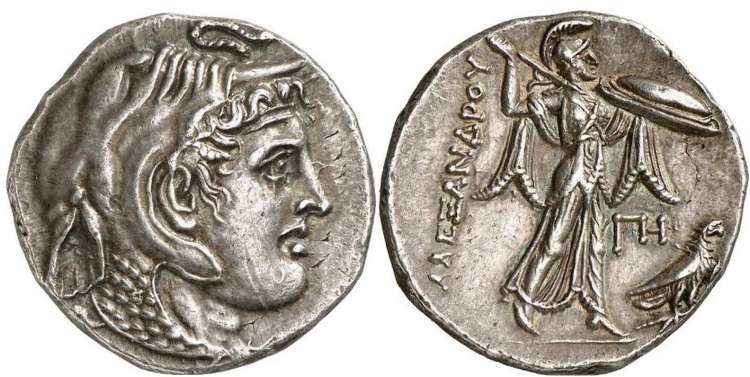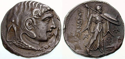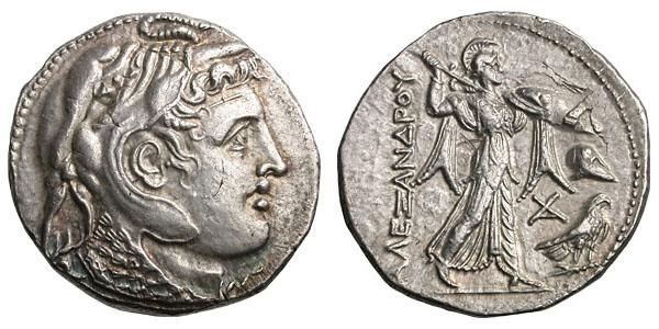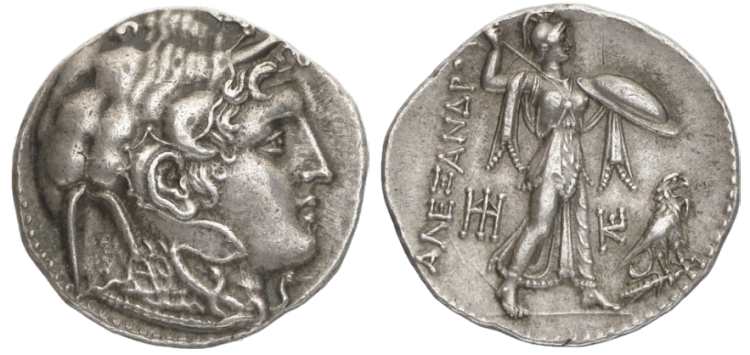 Svoronos 170 | Ptolemy I as Satrap, AR Tetradrachm in the name of Alexander. Alexandria mint, 311-305 BC. Head of Alexander right wearing elephant skin. / AΛEXANΔΡOY, Athena walking right, brandishing spear and holding shield on left arm. HΡ monogram, helmet and eagle on thunderbolt in right field. Svoronos 170; SNG Cop. 27; BMC 29-31 (one with a countermark); Warren Coll. 1319. | Text | Image |