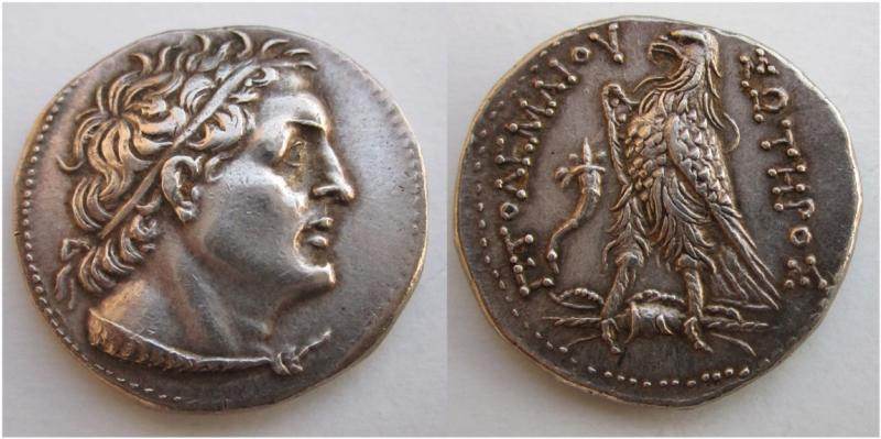 Svoronos 1001 | Ptolemy III Euergetes, AR tetradrachm, 247-220 BC. Alexandria mint. 14.3 gr. Diademed head of Ptolemy I right, wearing aegis, all within dotted border / ΠTOΛEMAIOY ΣΩTHΡOΣ to left and right of eagle with closed wings, standing left on thunderbolt; cornucopiae in left field. Svoronos 1001; SNG Cop 167-168; Berlin 28811; BMC 28 (under Ptolemy IV). | Text | Image |