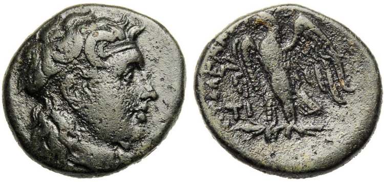 Svoronos 172 | Ptolemaic Kings Of Egypt. Ptolemy I Soter 305-282 BC. AE pentachalkon. 18 mm, 5.51 g. Alexandria. Struck circa 294-285 BC. Diademed head of Alexander III right, wearing horn of Ammon. / BAΣIΛEΩΣ ΠTOΛEMAIOY, Eagle standing left on thunderbolt, wings spread. Aplustre and helmet in left field. Svoronos 172; SNG Cop 36; BMC 62. | Text | Image |