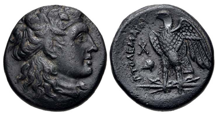 Svoronos 163 | Ptolemaic Kings Of Egypt. Ptolemy I Soter 305-282 BC. AE hemiobol. Alexandria. 17mm, 4.84 g. Struck circa 294-285 BC. Diademed head of Alexander III right, wearing horn of Ammon. / BAΣIΛEΩΣ ΠTOΛEMAIOY, Eagle standing left on thunderbolt, wings spread. XA monogram and helmet in left field. Svoronos 163; SNG Cop 43. | Text | Image |