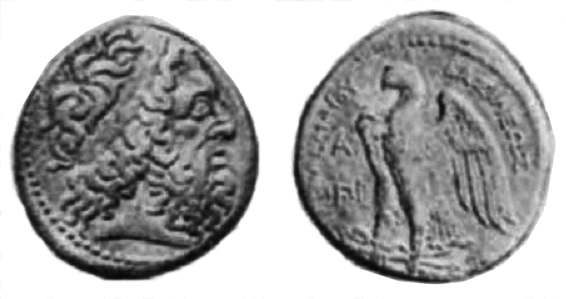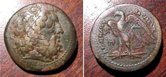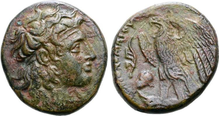 Svoronos 285 | Ptolemaic Kings Of Egypt. Ptolemy I Soter 305-282 BC. AE29 Alexandria. Struck circa 294-285 BC BC. Laureate head of Zeus right. / BAΣIΛEΩΣ ΠTOΛEMAIOY, Eagle standing left on thunderbolt, wings spread. A and ΠΡ monogram in left field. Svoronos 285; Sear 7763. | Text | Image |