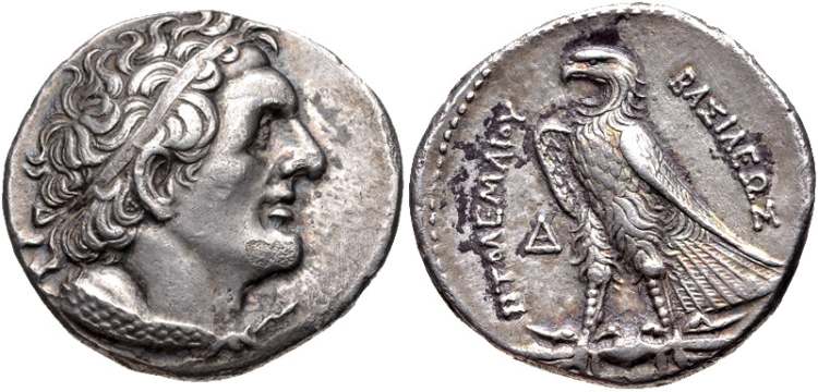 Svoronos 265 | Ptolemy I Soter AR Tetradrachm. 305-285 BC. Obverse die signed by the artist Δ. Alexandria mint. Diademed bust right, in aegis; small D behind ear / ΠTOΛEMAIOY BAΣIΛEΩΣ, eagle standing left on thunderbolt; P above monogram to right. BMC 9, SNGCop 73. | Text | Image |