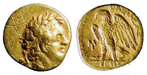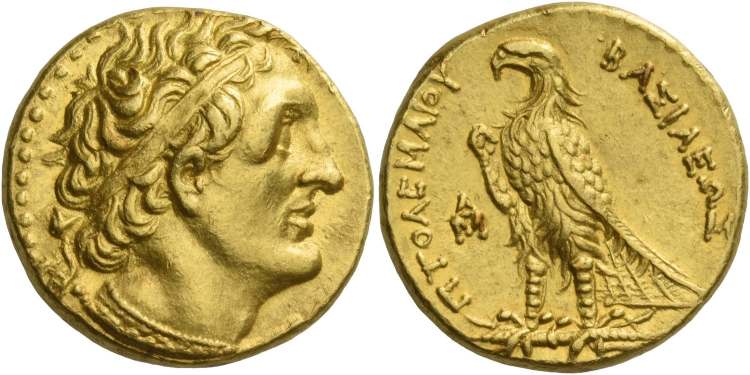 Svoronos 197 | Egypt, Ptolemy I Soter, as king, AV Hemidrachm. Alexandria, after ca. 295 BC. Diademed head of Ptolemy I right, with aegis around neck / ΠTOΛEMAIOY BAΣIΛEΩΣ, eagle with spread wings standing left on thunderbolt, MI monogram in left field. SNG Cop 45. | Text | Image |
