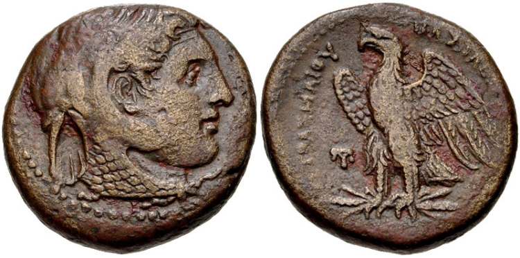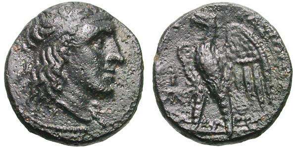 Svoronos 238 SG 7765 | Ptolemy I, AE20 hemiobol. 323-285 BC, Alexandria mint, 7.40 g. Diademed head of Alexander III right, wearing elephant skin headdress / BAΣIΛEΩΣ ΠTOΛEMAIOY, eagle standing left, wings spread. Sear 7765; Svoronos 238; SNG Cop 56. | Text | Image |