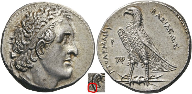 Svoronos 255 | Ptolemy I AR Tetradrachm. Alexandria mint. 25mm, 14.25 g. 300-285 BC. Diademed head of Ptolemy I right, with aegis at neck, small Δ behind ear / ΠTOΛEMAIOY BAΣIΛEΩΣ, eagle standing left on thunderbolt, wings closed. Ρ over ΠAΡ monogram in left field. Svoronos 255; Noeske 41-42; SNG Cop 70-71; BMC (Co-regency with Ptolemy II) 59; Sear 7762. | Text | Image |