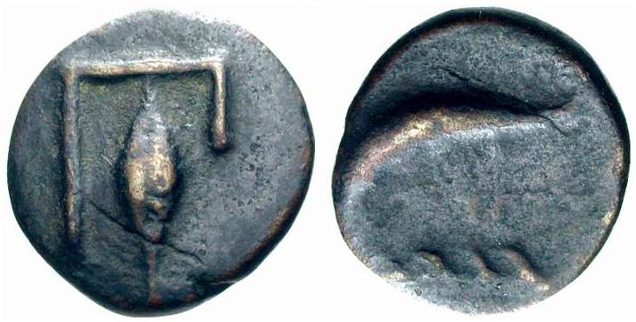 | BMC 35 | Pale, Kephallenia, Elis. AE16, 4th c. BC. 2.32 g. Π with barley corn within / Dolphin leaping left over waves. BMC 35; SNG Cop 468. | Text | Image |