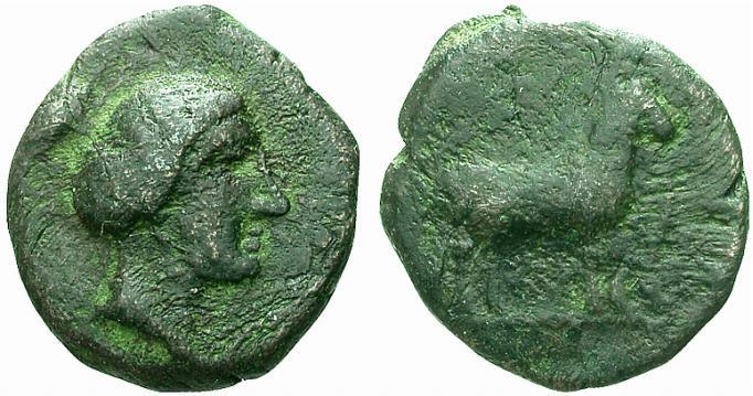| Traite 1270 | Same, Elis, Cephallenia, AE unit, ca 350 BC, 3.76 g. Head of Athena right, wearing crested Attic helmet / ΣAMAIΩN, ram standing right. Traité II-3, 1270; BMC 19 var (Athena head left). | Text | Image |