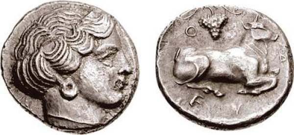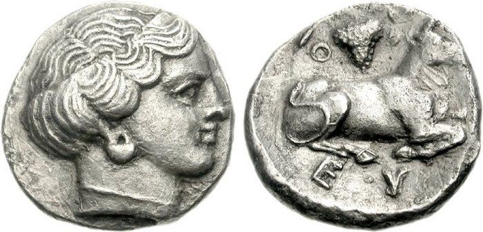 | BCD 5 | Euboian League AR didrachm or stater, ca 375-357 BC. 11.88 g. Head of the nymph Euboia right, wearing earring and plain linear necklace. / EY-B-OI, bull recumbent right, bunch of grapes above. BCD Euboia 5; Jameson 2077 = Pozzi 1496 (this coin); Wallace 12. | Text | Image |