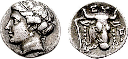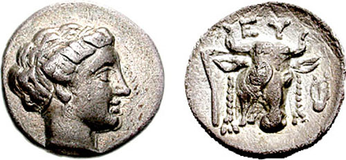 | BMC 11 | Euboia, Euboian League AR Drachm. Circa 304-290 BC. Head of the nymph Euboia left / EY, bull's head right, fillets hanging from horns; kantharos to right. | Text | Image |