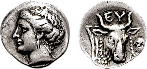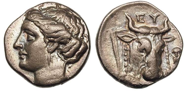| Sear SG 2464 | Euboean League, AR drachm. 4th cent. BC, drachm. Head of nymph Euboia right, hair rolled / EY-B, Cow’s head facing three-quarters to right, fillets hanging from horns. Sear SG 2464; BMC 3. | Text | Image |