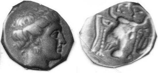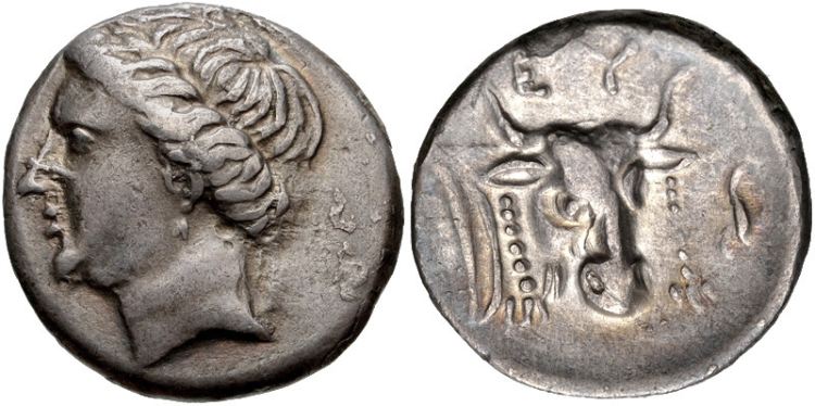 | BMC 13 | Euboean League AR Drachm. ca 304-290 BC. Head of nymph left, hair rolled / Filleted ox head three-quarters right, facing mask of Silenus in right field. | Text | Image |
