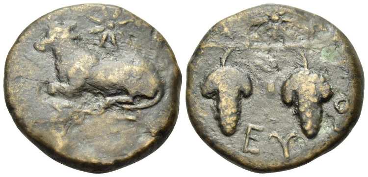 | BCD 46 | Euboian League. AE20, ca 304-290 BC. 7 g. Magistrate St. ΣT beneath bull recumbent left, star above. / EY B-O below and across fields, two bunches of grapes on a vine, star above. BCD Euboia 46; Wallace 7. | Text | Image |
