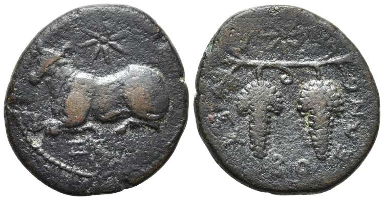 | SNG Cop 492 | Euboian League, AE22. ca 304-290 BC. 5.66 g. Magistrate Xe. ΞE beneath bull recumbent left, star above. / EYBOEΩN, two bunches of grapes on a vine, star above. BCD Euboia 44; SNG Cop. 492. | Text | Image |
