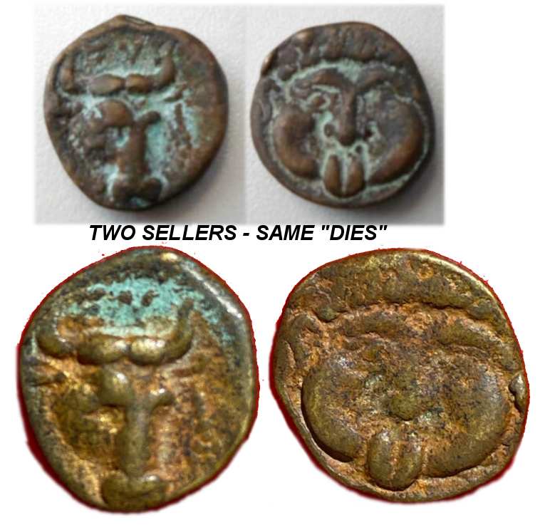 | Euboian League Fake | Euboian League / Neapolis modern cast fake. AE 15 mm, 3.3 g. Head of gorgoneion facing (copying coins of Neapolis) / EY above bull's head facing. (copying coins of the Euboian League). Modern fantasy fake, sold to tourists and other unsuspecting buyers since ca. 2019 to the present date. | Text | Image |
