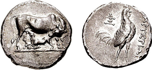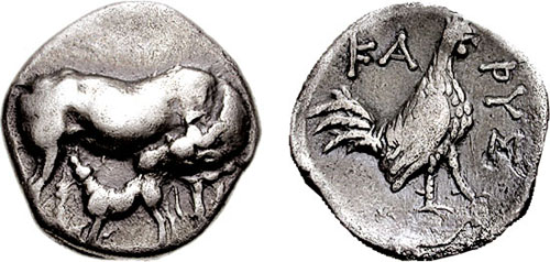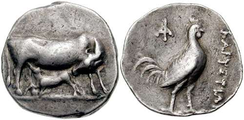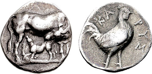 BCD 570 | Euboia, Karystos. Circa 300-250 BC. AR Stater. Cow standing right, suckling calf / Cock standing right. Robinson, Carystus 19; BCD 570; SNG Copenhagen 415.