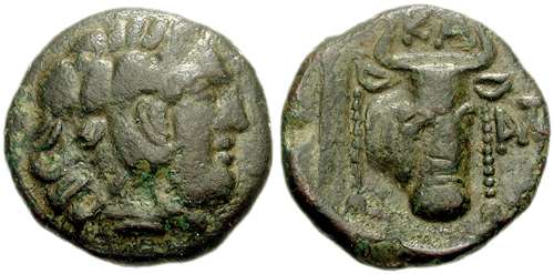 BMC 19 | Euboea, Karystos, ca 197-146 BC, Æ 17mm. Head of Herakles right, in lion's skin headdress / KA above filleted bull's head facing, PVT monogram before. BCD 586, SNG Cop 421.