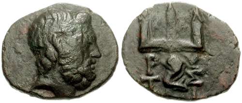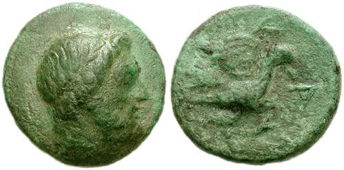 BMC 24 | Euboea, Karystos. Circa 197-146 BC. Æ 17mm (3.47 gm). Head of Posiedon right / Dolphin entwined upward on trident. BCD 590, SNG Copenhagen 423.