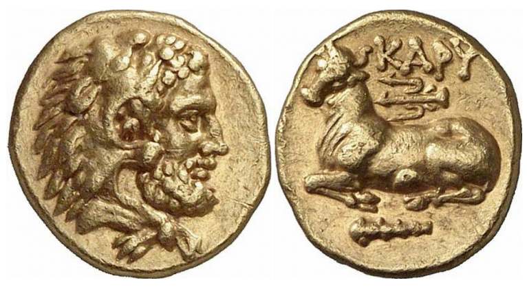 Sear SG 2510 | Euboia, Karystos. Revolt of Ptolemaios. AV Drachm. ca 313 BC. Head of Herakles right, in lion's skin headdress / KAPY, bull recumbent left; trident above, club below. BCD 573; BMC 17, Jameson 2066. | Text |  |