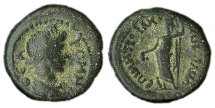 wwxls 42086 | Caracalla AE22 of Ankyra, Galatia. AD 198-217. 7.76 g. ANTΩNEINOC AYΓ, laureate head right, slight drapery on left shoulder. / MTΡOΠO ANKYΡAC, Nemesis standing left, holding cubit-rule and bridle in her left, wheel at feet left. wwxls 42086. Unpublished legends. | Text | Image |