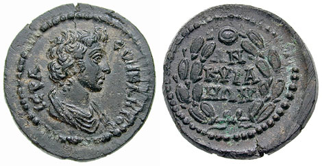 Cankirikapi 50 var | Caracalla, AE18 of Ankyra, Galatia, AD 198-217. 2.59 g. ANTΩNINOC AYΓ, laureate head left. / MHT ANKYΡAC (MHT ligate), cornucopiae. Obverse var of Cankirikapi hoard 50-51 and Arslan 1991, 36 (both with head right). | Text | Image |