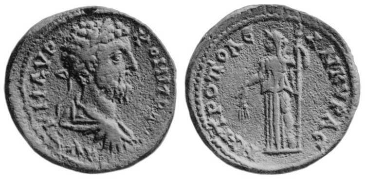 SNG Fr. 2460 | Lucius Verus, AE26 of Ancyra, Galatia. 161-169 AD. AYT AVΡ OYHΡOC CE, Laureate head right / ANKYΡAC MHTΡO, Octastyle temple; shield in pediment. SNG France 2460; SNG von Aulock 6142. | Text | Image |