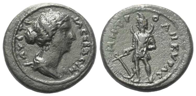 BMC 8 | Faustina II, AE22 of Ancyra, Galatia. AD 146-180. 7.52 g. ΦAYCTEINA CEBACTH, draped bust right. / MHTΡO ANKYΡAC, Mên standing left, wearing Phrygian cap. crescent on shoulders, holding anchor and pine-cone. BMC 8; Paris 88; SNG France 2453; Waddington 6610; Arslan Ancyra 95-97; SNG von Aulock 6141. | Text | Image |