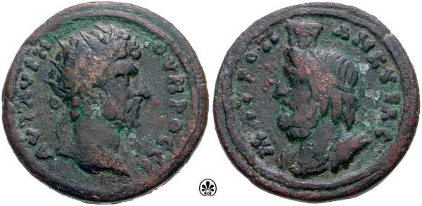 Arslan 16v | Lucius Verus AE 26mm of Galatia, Ankyra. AYT AYΡH OYHΡOC CE, radiate head right / MHTΡOΠ ANKYΡAC, diademed head of Sarapis left, wearing modius. Arslan 16 var (obv. bust type). Apparently unpublished. CNG 24, 61909. | Text | Image |