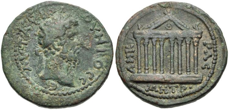 BMC 28 | Caracalla AE22 of Ankyra, Galatia. AD 198-217. 8 g. ANTΩNINOC AYΓOYCTOC, laureate, cuirassed bust right. / MHTΡOΠOΛEΩC ANKYΡAC around distyle temple-shaped stele, with prize crown in pediment and inscribed ACKΛH-ΠEIA CΩ-TIΡEIA-ICO ΠY-ΘIA in five lines. BMC 28; SNG France 2513-2514. | Text | Image |