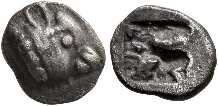 | DLT 387 | Massalia. AR 3/4 Obol, ca 500-475 BC. 9 mm, 0.85 g. Ram's head left. / Rough incuse square. Auriol Group Qa; Maurel 49; LaTour 387. | Text | Image |