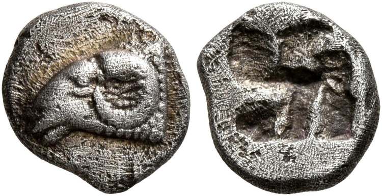 | DLT 253 | Massalia. AR Hemiobol, ca 500-475 BC. 8 mm, 0.55 g. Calf's head right. / Rough incuse square. Auriol Group S; Maurel 52; LaTour 253. | Text | Image |